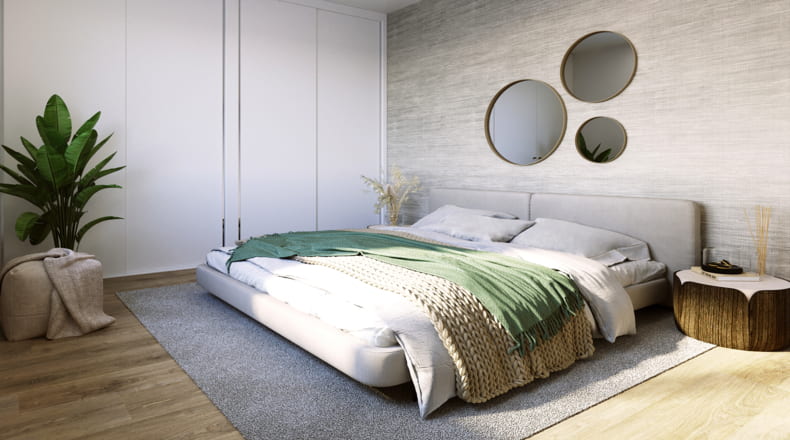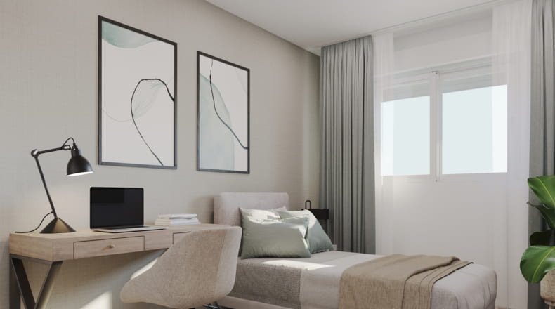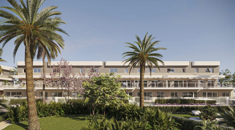 The properties for sale offer options of 2 or 3 bedrooms and 2 bathrooms, with spacious living rooms that open onto terraces and integrated kitchens that maximize light and space. The generous terraces and communal gardens create a private and serene atmosphere. Each home has been designed with high-quality materials and finishes that guarantee elegance and comfort. The kitchens are fully furnished and equipped with a ceramic hob, extractor hood, oven, and microwave.